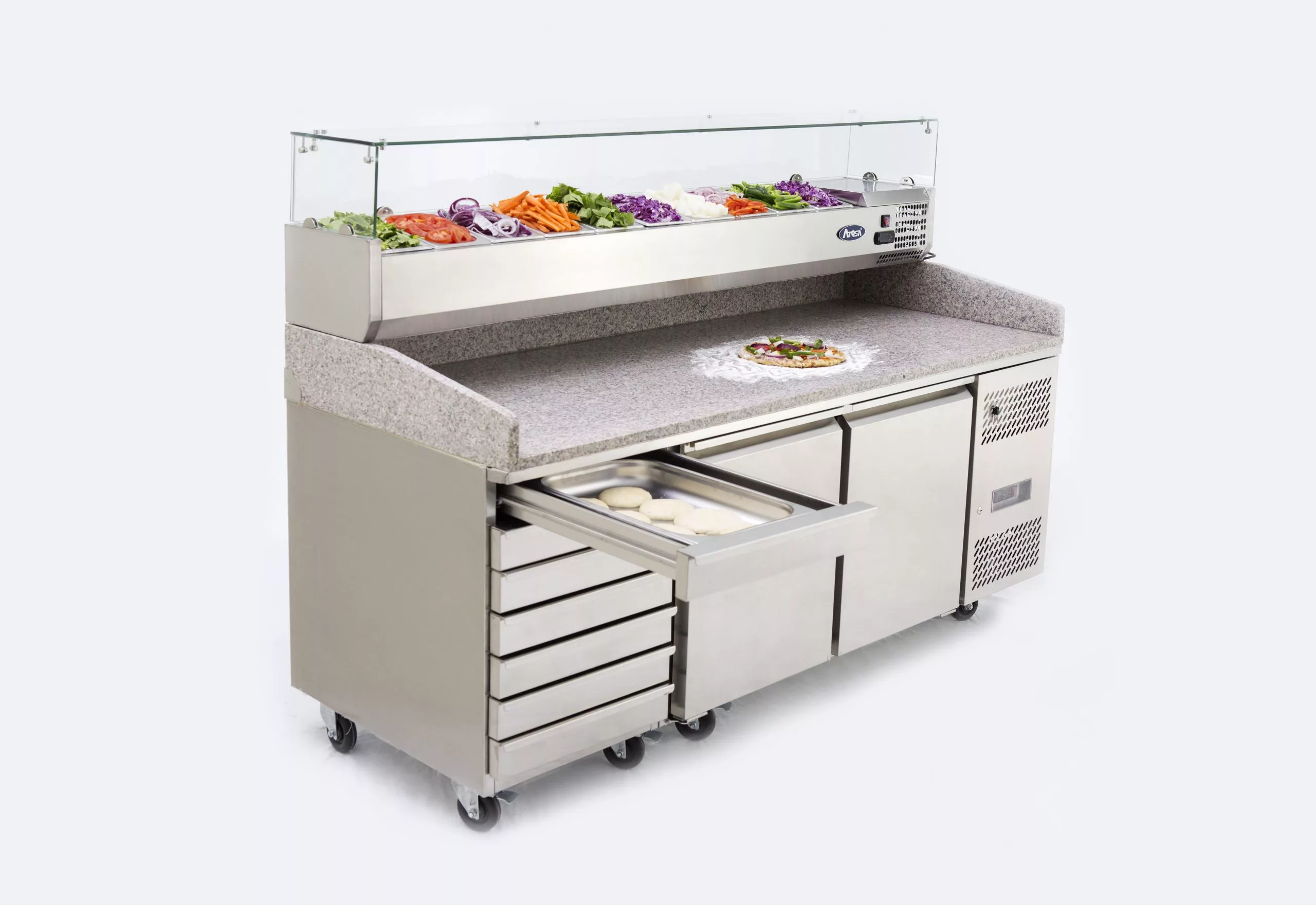 The Atosa EPF3480GR 2 Door + 7 Drawer Pizza Table is from Atosa’s green range. It benefits from improved energy efficiency and lower running costs whilst still being able to perform in an environment with an ambient temperature of up to 43 ?C.