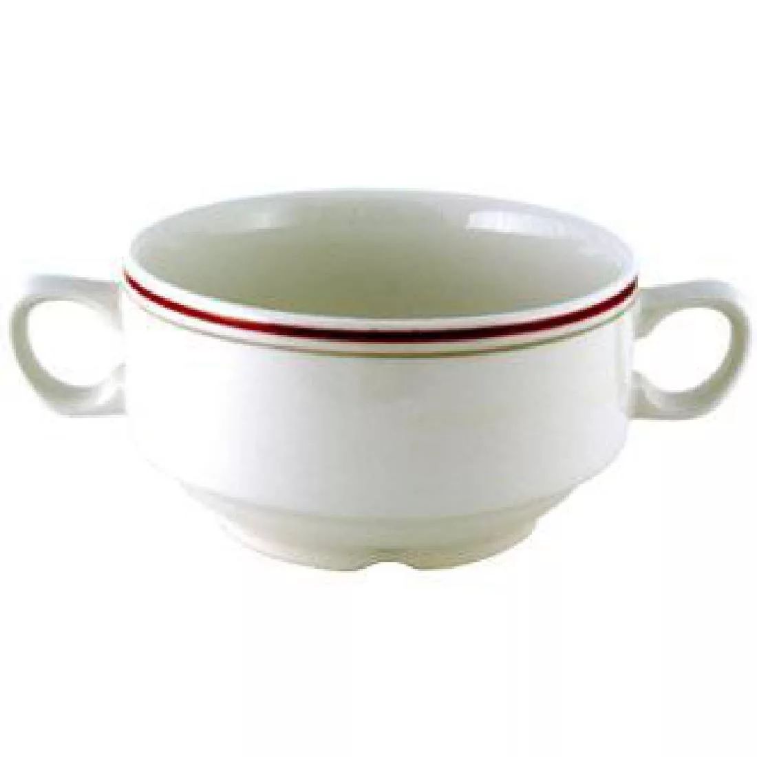 Nova collection by Churchill combines contemporary understated design with functionality and durability combined with Clyde, a simply designed elegant edging of contrasting maroon and grey bands. These handled soup bowls have a vitreous body which does not absorb moisture making them more hygienic.