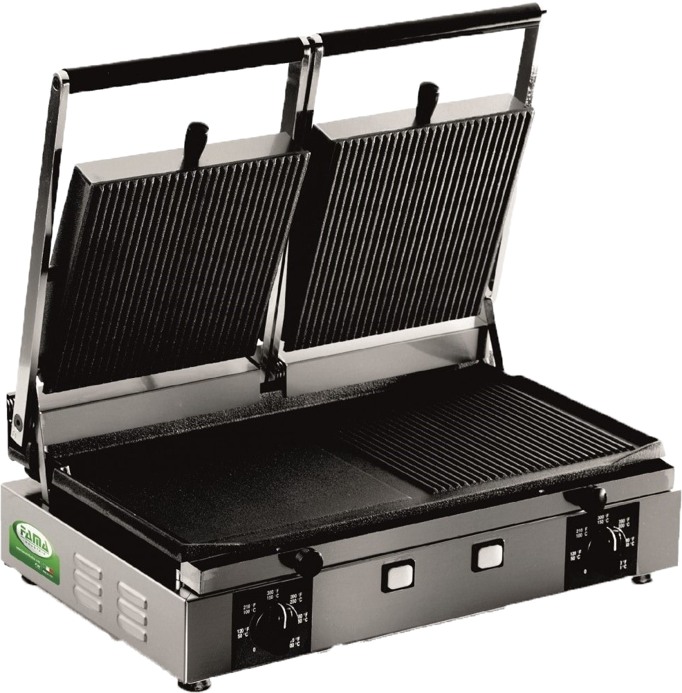 The heavy-duty double contact grill from Fama features cast iron plates with an exceptionally hard wearing ceramic coating which is integrated into the iron itself for a longer life. As well as improved thermal conductivity this makes cleaning as simple as wiping away any residue. Dual temperature controls allow for products to be cooked at different temperatures on the left and right sides of the grill. Counter-balanced upper plates and the choice of ribbed or smooth surfaces ensure that food is cooked to perfection every time.
