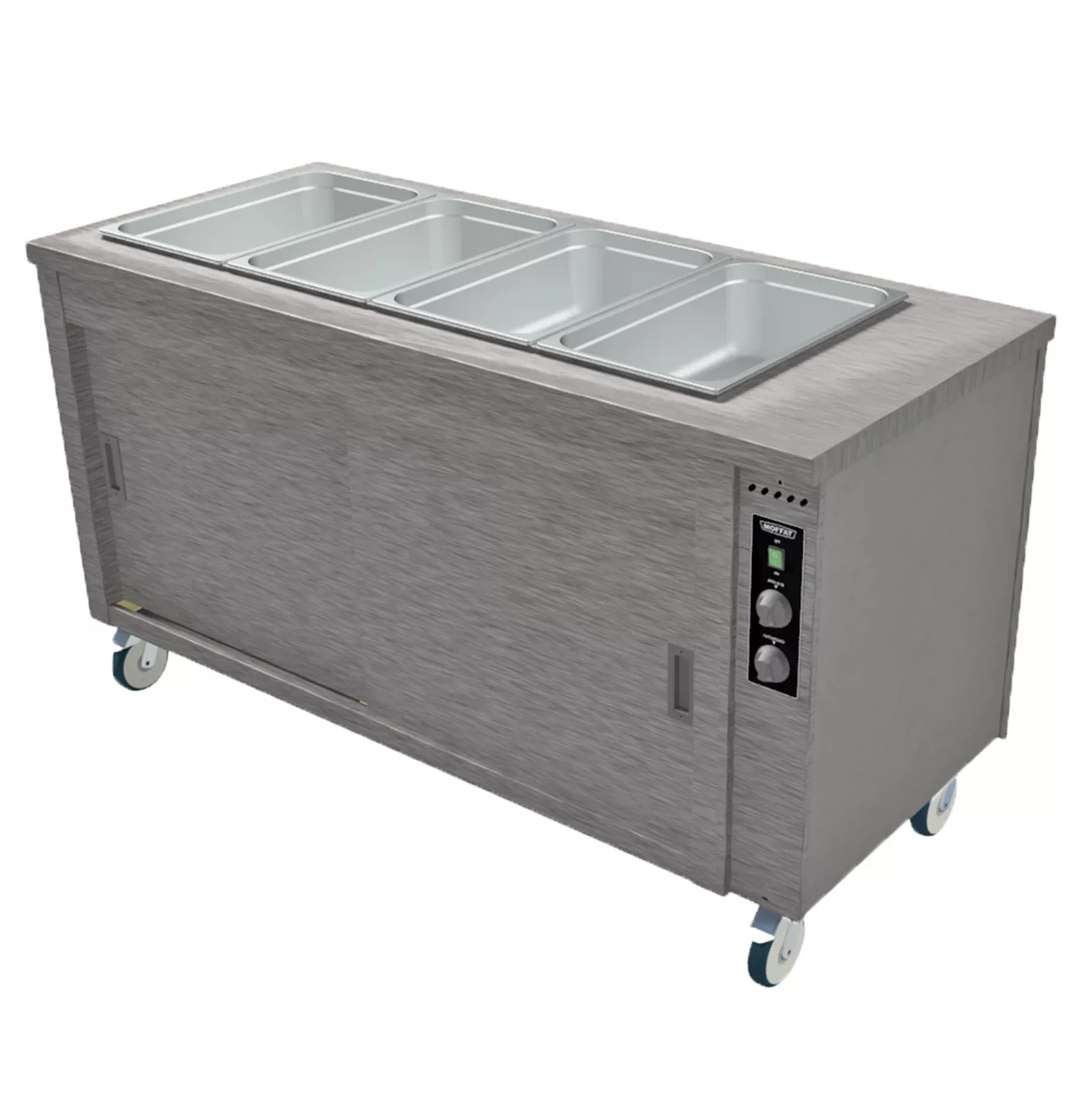 Bainmarie with hot cupboard that has doors on both sides. E&R Moffat Ltd were the originators of a Bainmarie that could be either wet or dry heat. This type of system was designed to offer flexibility and was developed to eliminate the need to fit a low water level warning system or the expense of replacing burned out elements. Wet heat water level is an economic 20 mm deep, complete with drain valve and swing out run off tube for easy emptying /cleaning. A heavy-duty range available in four lengths designed to accommodate 1/1 Gn pans. Excellent for pre-heating plates and dishes, as well as the temporary storage of pre-cooked food. These units incorporate a very efficient heating system in addition to the fully enclosed heating elements fitted under the Bainmarie well excess residual hot air from the hot cupboard is also used to maintain temperature. Use individual or as a part of a specialised Moffat servery counter.