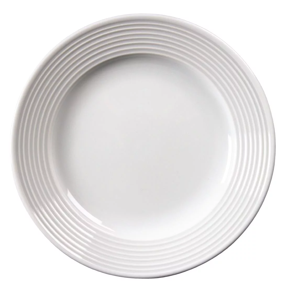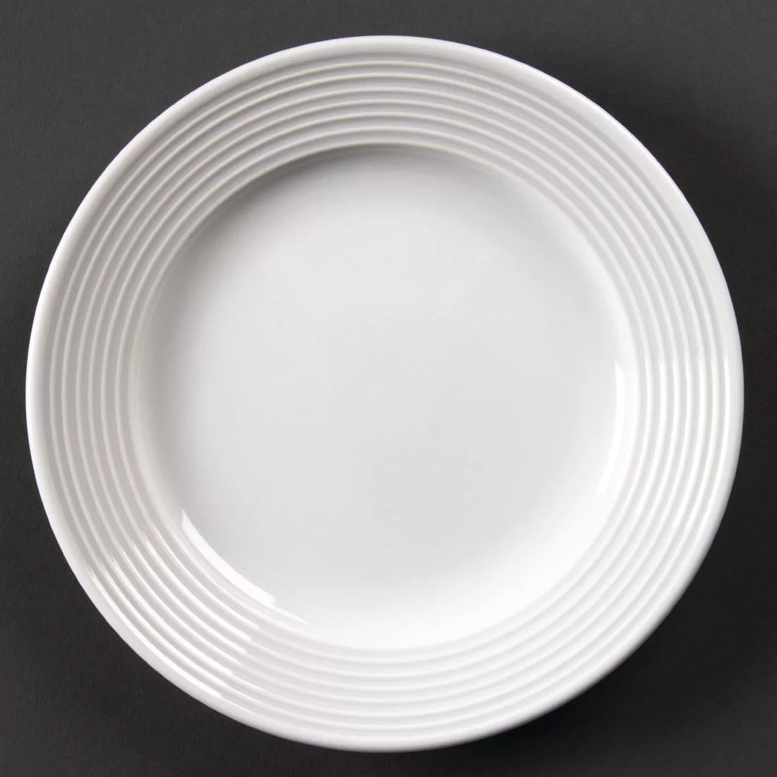 This modern style, 6.5″ wide-rimmed plate from the Linear range by Olympia is made from plain white porcelain and features a delicately embossed lined pattern. The plate is fully vitrified, giving excellent heat and shock resistance and glaze durability, making it robust and able to withstand the rigours of a professional catering establishment.