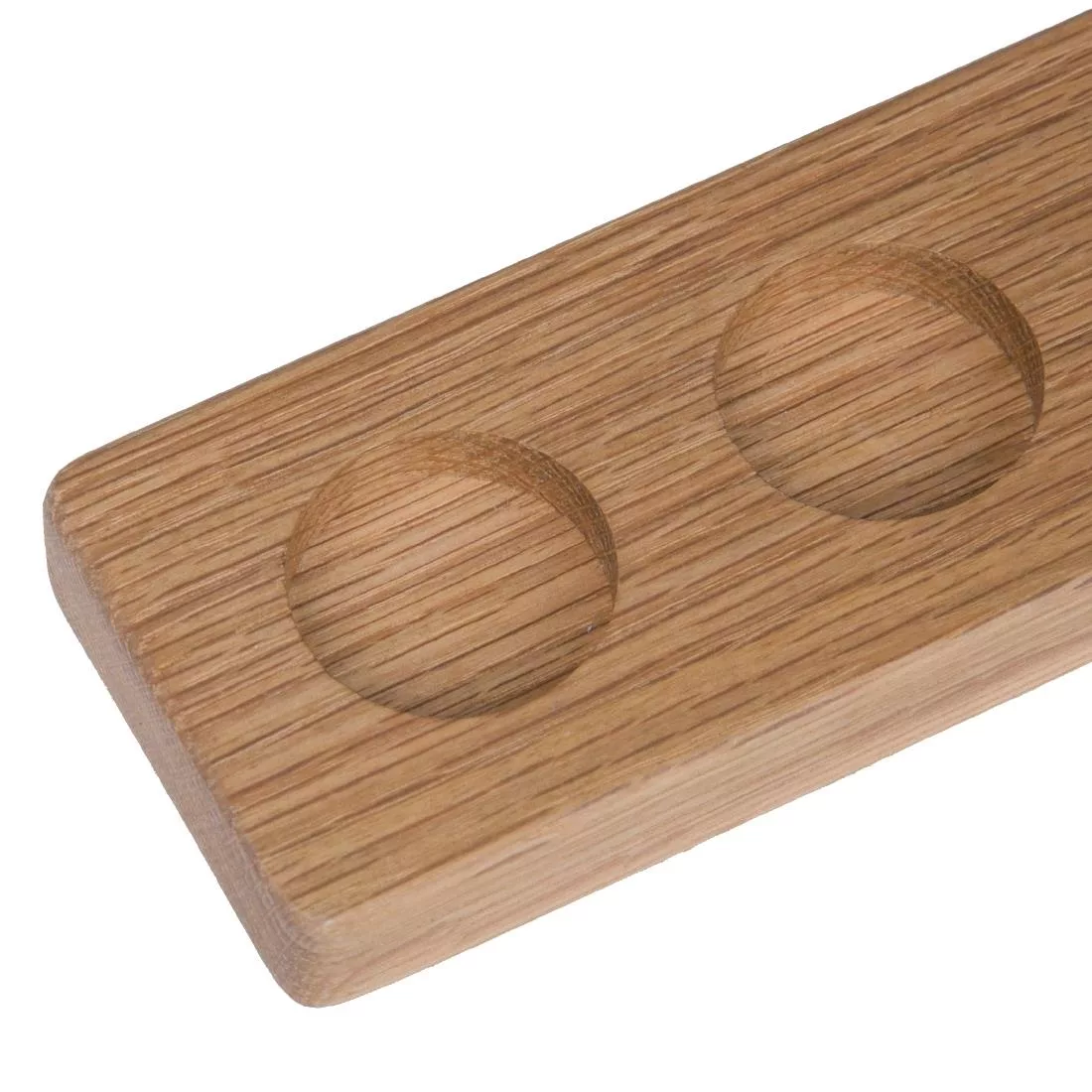 Carry shot glasses or dessert tasters safely and easily using this 500(W) x 60(D)mm Olympia six shot wooden paddle board. Featuring six deep recesses, this flight board keeps your shot glasses held securely, preventing spills when carrying. Crafted from solid oak wood, this board is incredibly strong, meaning you don’t have to worry about any flex in the paddle when full. The oak construction and an oiled finish also give this board a delightfully rustic look, adding warmth and character to your drinks service.