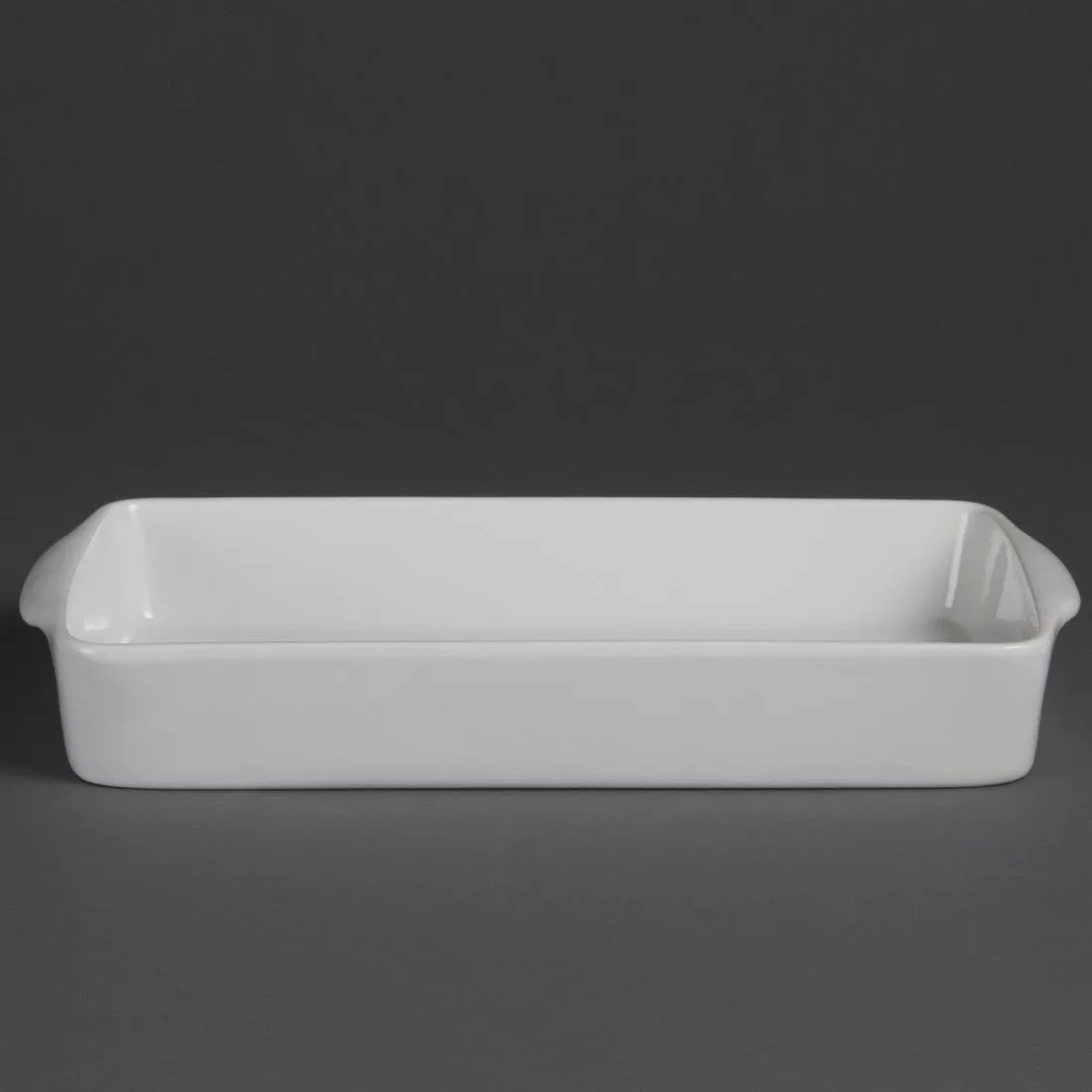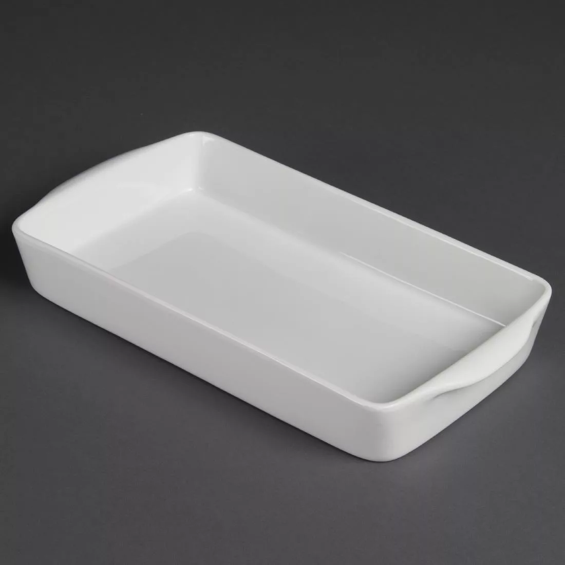 An rectangular roasting dish from Olympia, designed to provide a great value and hardwearing pure white porcelain crockery solution for busy hotels, canteens and restaurants. Strengthened rolled edges ensure the dish is chip resistant and the fully vitrified body gives great glaze durability, making it ideal to withstand the rigours of the professional catering environment. The roaster is oven, microwave, dishwasher and freezer proof.
