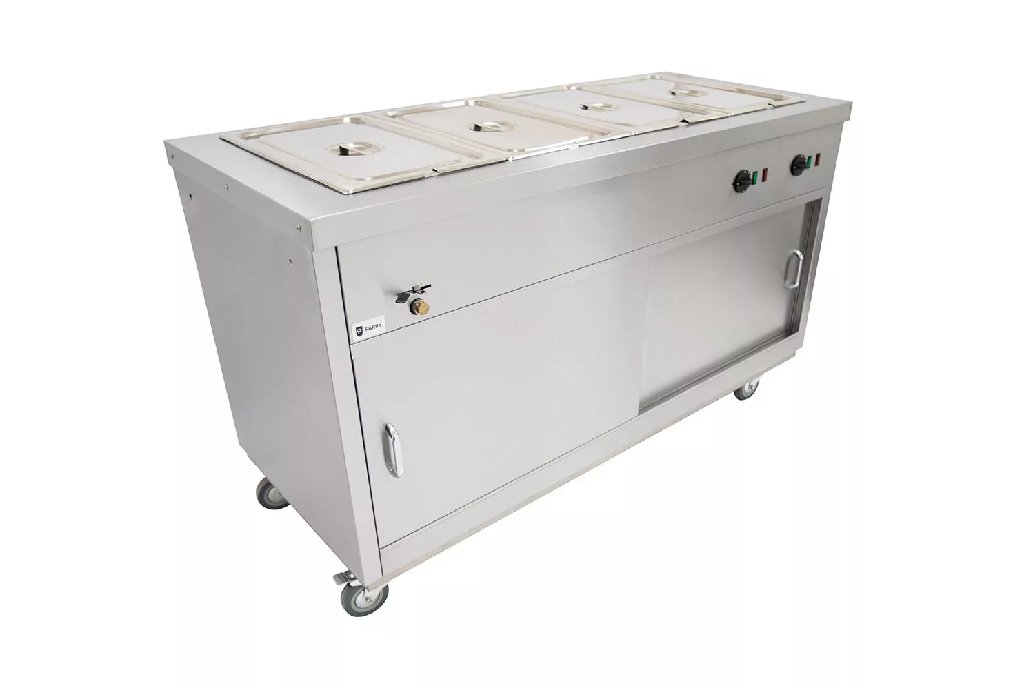 The Parry HOT15BM Hot Cupboard With Bain Marie Top has a strong stainless steel construction, the unit has 4 strong castors where 2 are lockable. Built with removable sliding doors for easy cleaning! The hot cupboard has double skinned doors and walls and is temperature regulated throughout by thermostat. Accepts 4 x 1/1 size gastronorms.