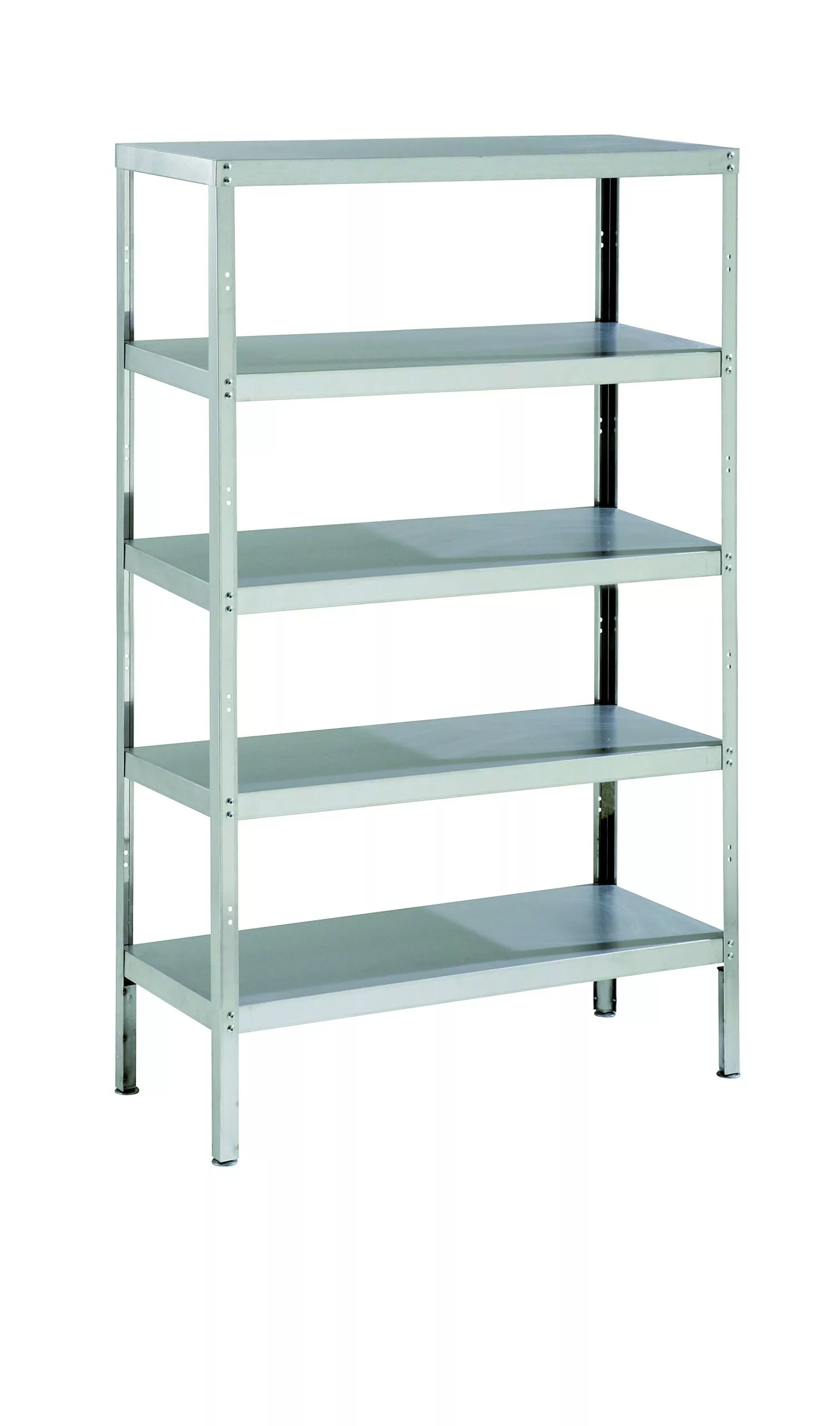 A high quality stainless steel storage rack which has 5 solid shelves and adjustable feet. 400mm deep which will require a wall tie bar, the legs are made using 30mm box section.