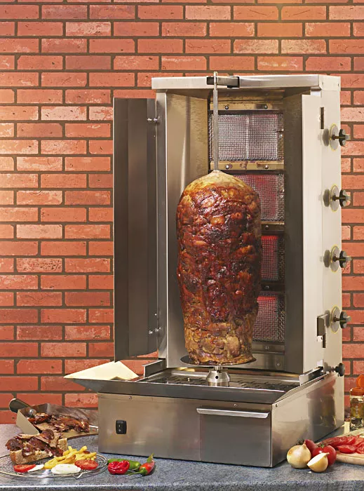 The vertical gas grill GR 80 G can cook or reheat a spit of 40-kg-kebab or gyros meat thanks to 4 infrared burners with safety thermocouples. The independent regulation of each gas burner enable you to vary the cooking from low position to large flame.