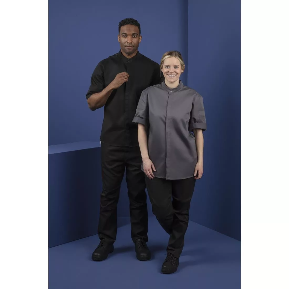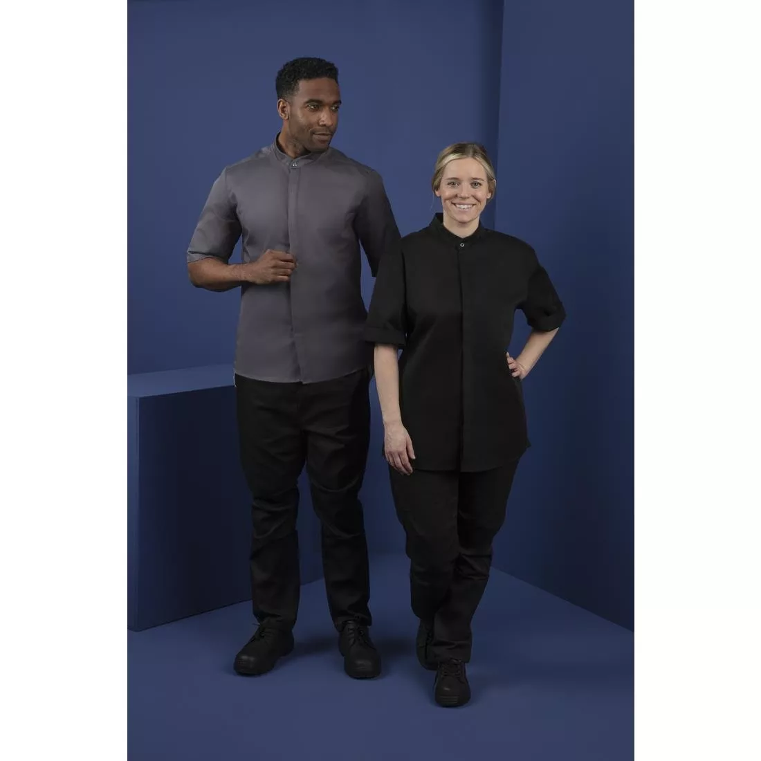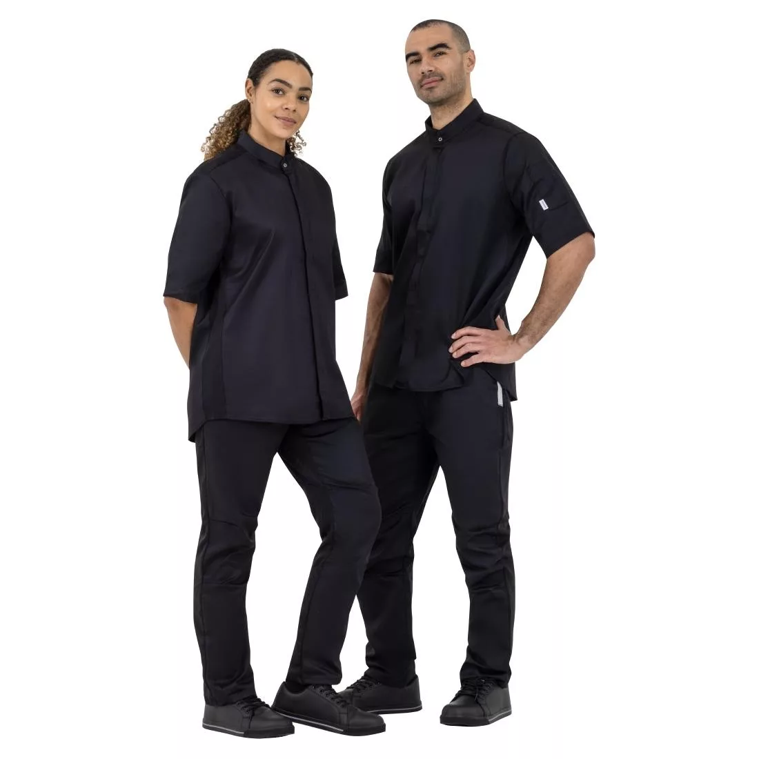 The Southside band collar jacket is made from lightweight 190 gram material, short sleeves and features a breathable panel at both sides – great for keeping comfortable in hot and busy professional kitchens. The band collar is not as heavy as a typical double breasted chefs jacket collar. It will be comfier to wear all day long, and adds an element of style to the chefs jacket. Available in 4 colourways; white, black, khaki and charcoal.